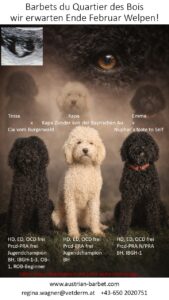 Als Tierärztin züchte ich im Norden Österreichs, dem Waldviertel, die Hunderasse Barbet (französischer Wasserhund). Die Barbets sind Hunde, die besonders viele positive Eigenschaften vereinen.